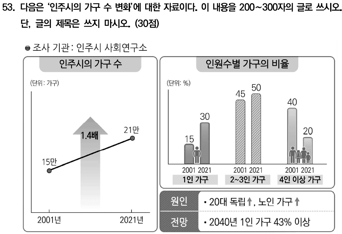 질문 : ‘인주시의 가구 수 변화’ 에 대한 글을 쓰라는 문제입니다. 그리고 ‘인주시의 가구 수’, ‘인원수별 가구의 비율’, ‘원인’, ‘전망’ 네 가지 자료가 문제에 있어요. 주제는 무엇인지, 어떤 내용을 어떤 순서로 써야 하는지 생각해보고 글을 써 봅시다. 단위, 수치, 변화 표현, 단어를 문장으로 바꾸기 등을 잘 생각해서 글을 쓰세요.