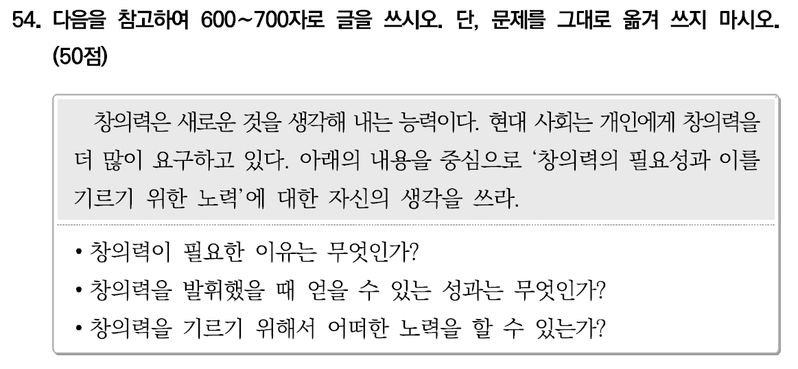 질문 : ‘창의력’에 대한 글 을 쓰라는 문제입니다. ‘창의력’에 대한 간단한 소개글과 질문 3가지가 문제에 나와 있습니다. 서론에 어떤 내용을 써야 하는지 생각해보고 글을 써 봅시다. 서론에서 자주 쓰이는 표현을 잘 생각해서 글을 쓰세요. 문제를 잘 읽어보면 어떤 내용을 써야 할지 아이디어를 얻을 수 있어요. 글감을 잘 생각해보면서 서론을 써 봅시다.